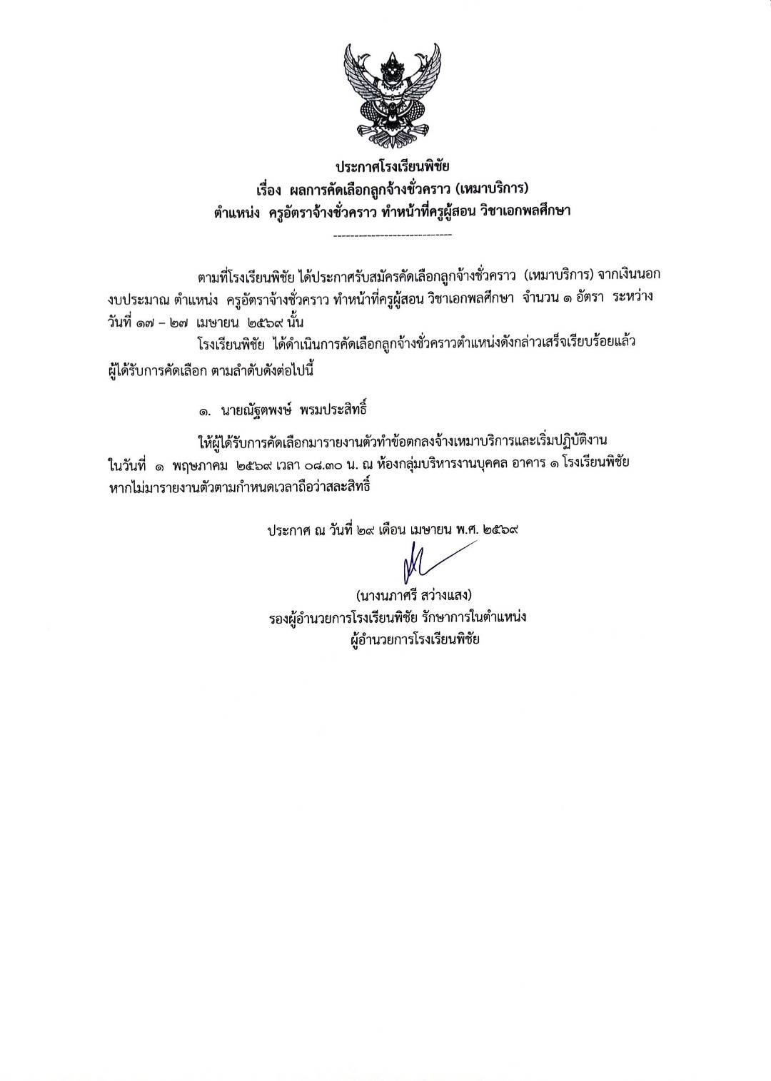 ประกาศโรงเรียนพิชัย เรื่อง ผลการคัดเลือกลูกจ้างชั่วคราว (เหมาบริการ) ทำหน้าที่ครูผู้สอน วิชาเอกพลศึกษา (29/04/69)